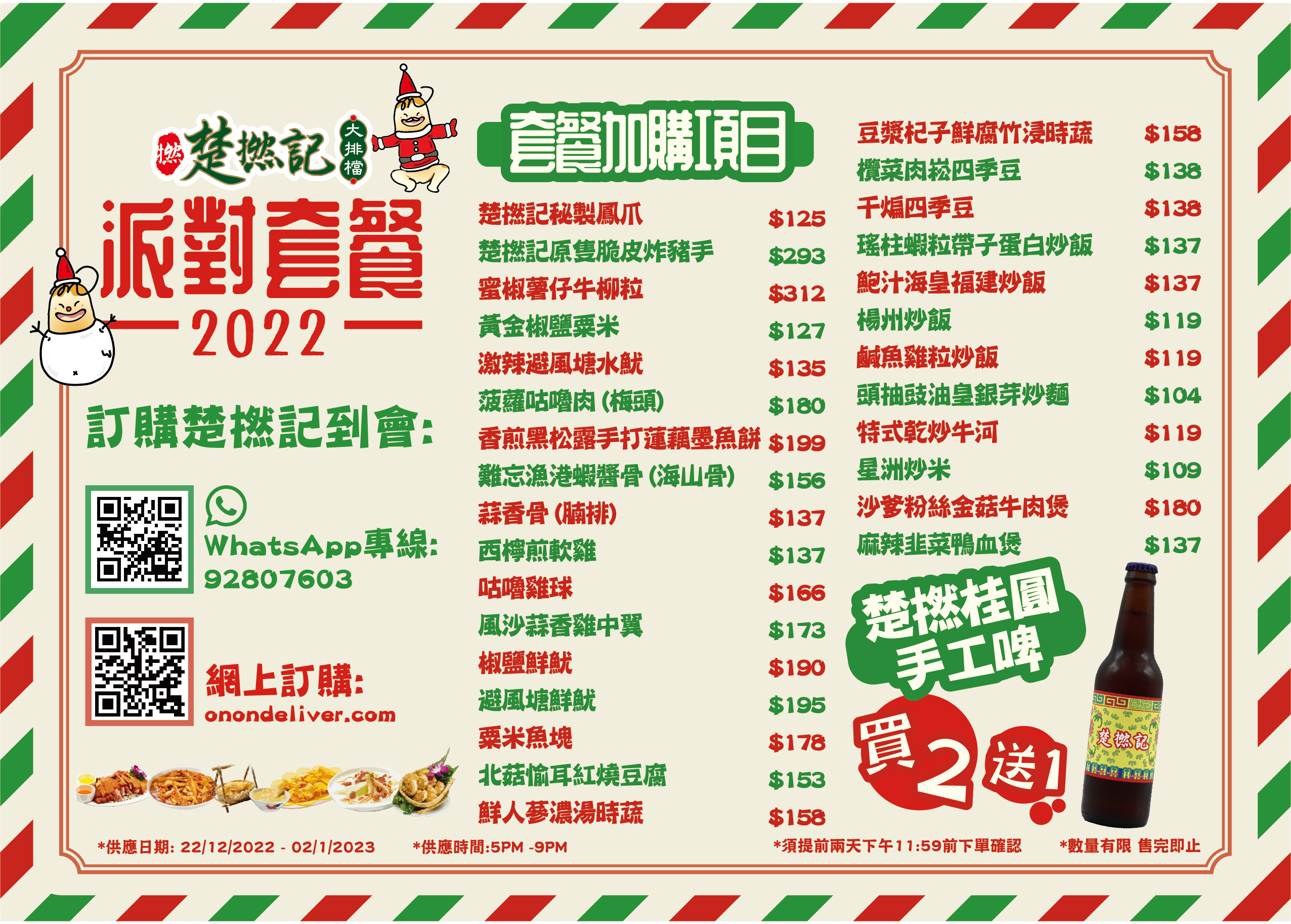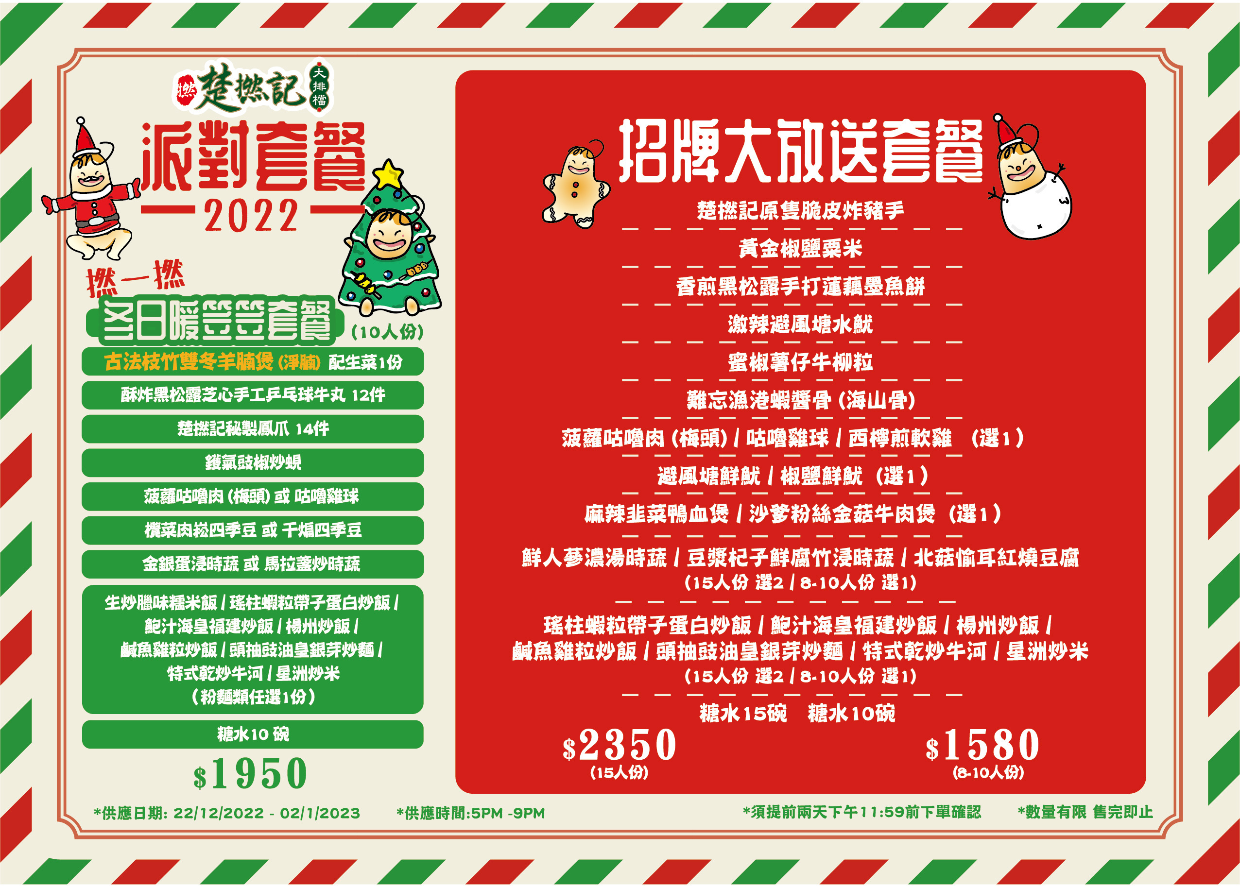 *派對套餐供應日期: 22/12/2022-02/01/2023,須提前兩天預訂,送貨時間: 5:30pm-9pm*